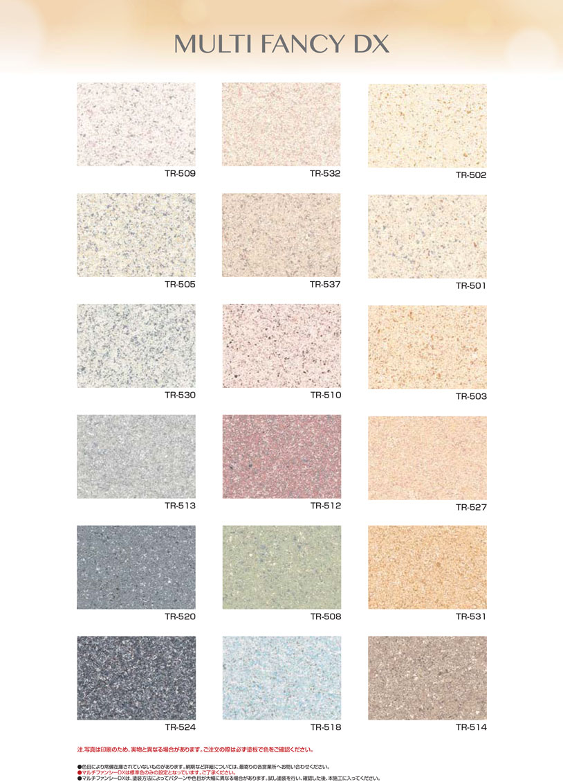 - マルチファンシーDXは、塗装方法によってパターンや色目が大幅に異なる場合があります。試し塗装を行い、確認した後、本施工に入ってください。